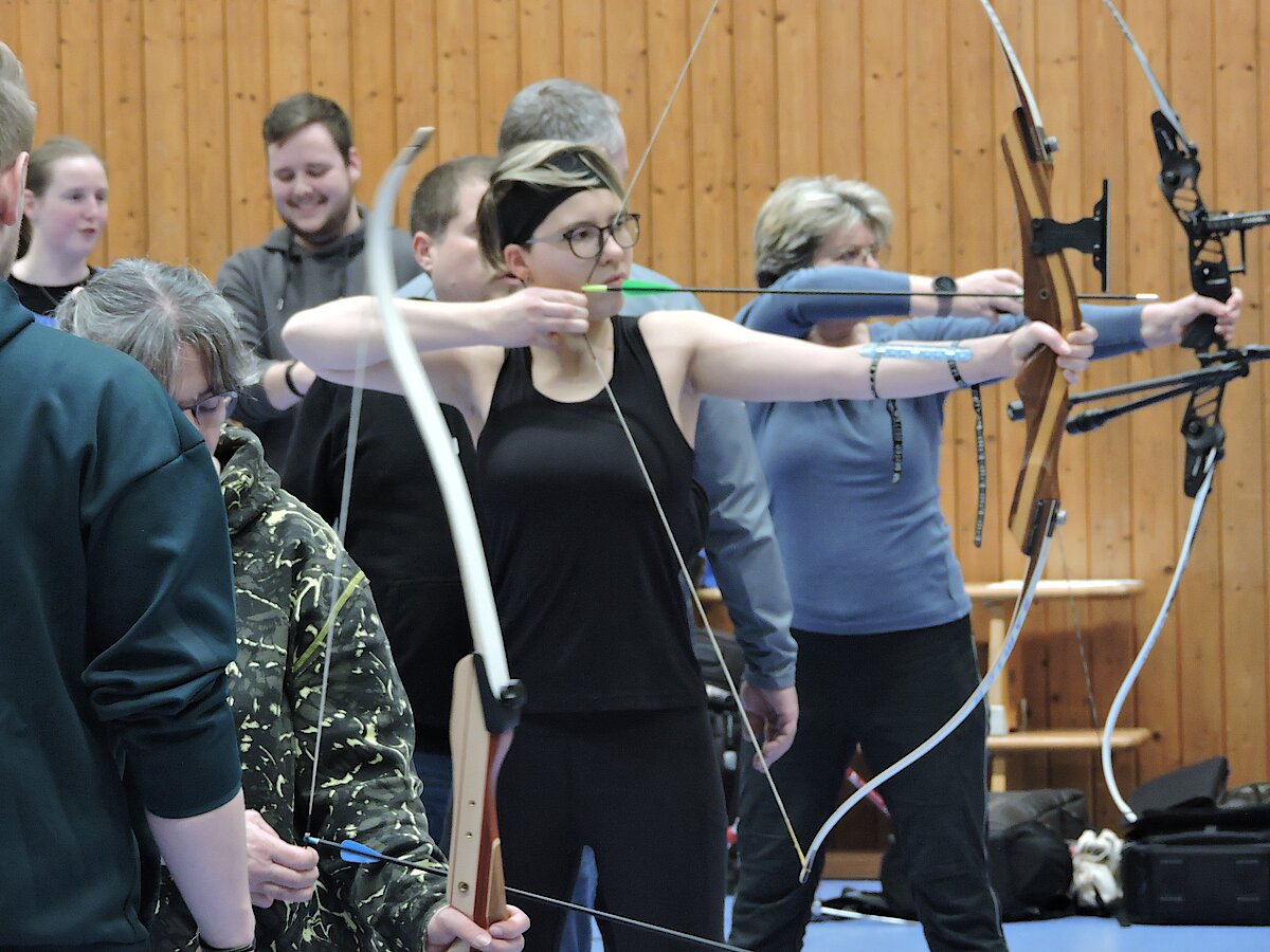 Als Höhepunkt wurden die zukünftigen Gewehr- und Pistolentrainer*innen von den werdenden Bogentrainer*innen im praktischen Umgang mit Pfeil und Bogen angeleitet.
