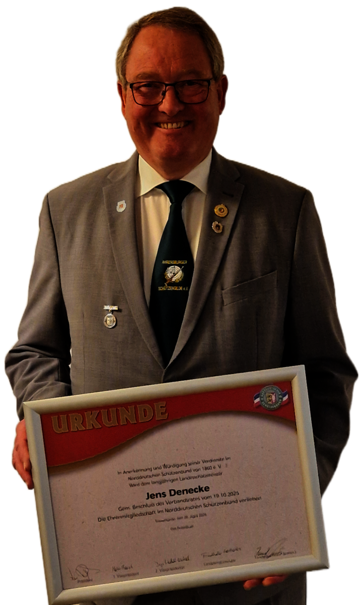 In Anerkennung seines langjährigen, herausragenden Engagements wurde der ehemaligen Landesschatzmeister und Vizepräsident Jens Denecke zum Ehrenmitglied des Norddeutschen Schützenbundes ernannt.