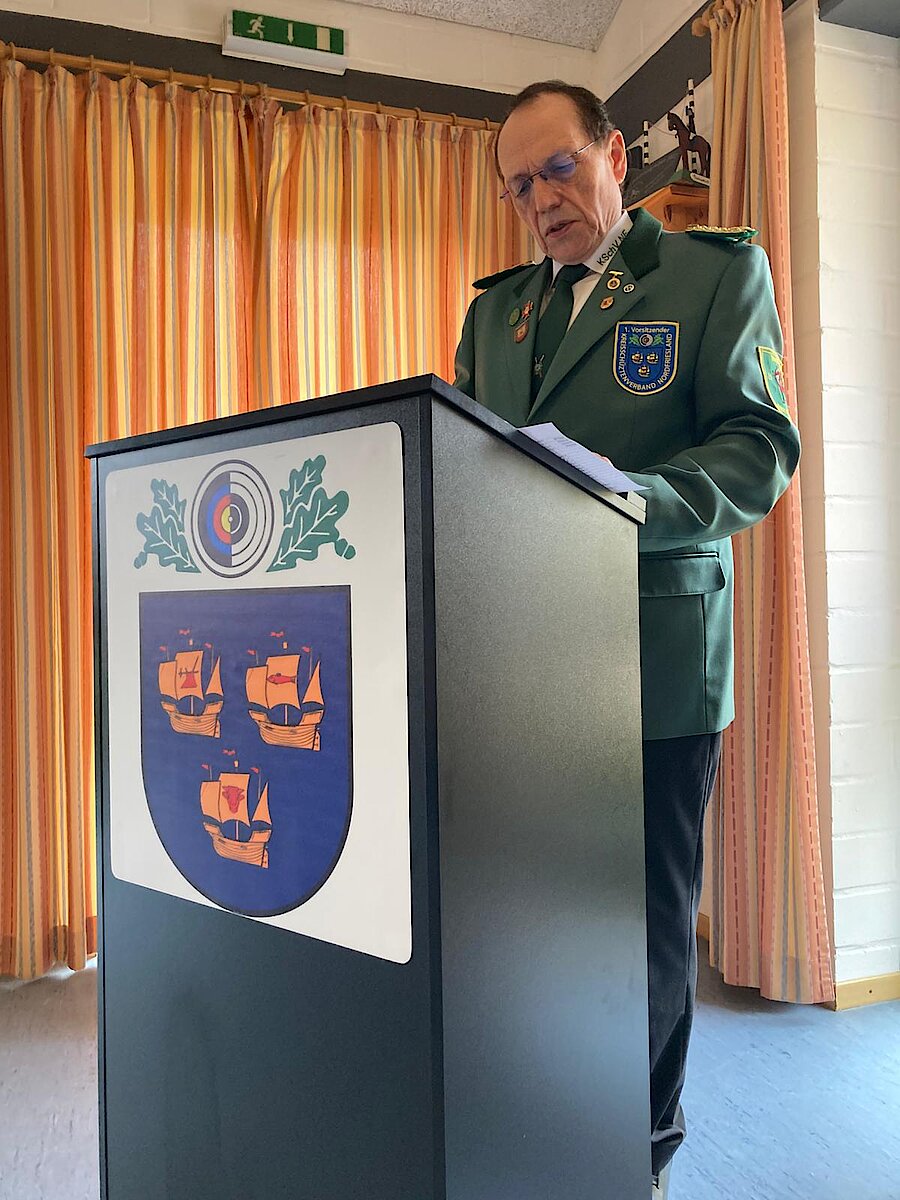 Nach der Eröffnung und dem Gedenken an die verstorbenen Mitglieder wurde die ordnungsgemäße Einberufung sowie die Beschlussfähigkeit festgestellt. In ihren Grußworten hoben Jens Peter Jensen, 1. stellvertretender Kreispräsident und Kreistagsabgeordneter, sowie Lars Rotfuß, Präsident des Norddeutschen Schützenbundes, die Bedeutung des Schützenwesens für den gesellschaftlichen Zusammenhalt hervor. Weitere Beiträge kamen von Christiane Ehlers (Ehrenvorsitzende, Kreis Dithmarschen), Thomas Koll (KSchV Dithmarschen) und Horst Kratzl (KSchV Schleswig-Flensburg).