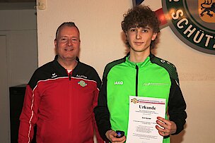Der Vorjahreskönig Lukas Bünning vom SSV Kassau erhielt vom Landesjugendleiter Andreas Seibt zur Erinnerung an sein zweites ereignisreiches Königsjahr einen Orden überreicht.